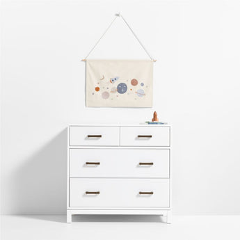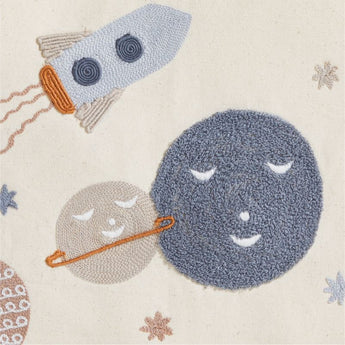 Our Space Kids Canvas Wall Tapestry is an adorable addition to any kid's room or nursery decor. Made of flecked organic cotton, the all-embroidered tapestry features a cheerful array of planets and showcases a variety of embroidery techniques, bringing texture and warmth to a room. The perfect size to hang above a crib or bed, it requires no frameonly a nailto hang. Best of all, it can be customized with an embroidered monogram to put a personal stamp on their space. Add our Space Canvas Growth Chart for a coordinated look.