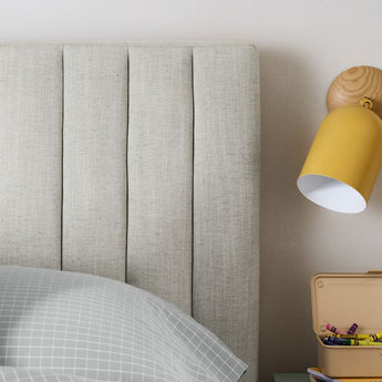 Largely inspired by Scandinavian farmhouse design, our Finn collection blends rustic charm and modern minimalism. The upholstered bed is designed to pair seamlessly with the rest of the collection, with a channel-tufted headboard that mimics wood paneling. The oversized headboard provides a comfy spot for lounging and reading, and the natural-hued fabric wraps the entire frame for complete softness. Tapered solid wood legs add a bit of a lift plus a touch of natural warmth. This cool, modern design will grow with little ones through each stage. Pair it with our Finn Dresser, Nightstand and Bookcase for a coordinated look.