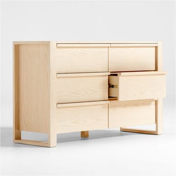 Light and bright in gorgeous washed ash and poplar wood, our Gemini 6-Drawer Dresser brings clean, simple storage to your nursery or kid's bedroom. Horizontal pulls across the face of each drawer enhance the modern, linear look. Skillfully crafted to last in solid ash, poplar and ash veneer, it's finished with subtle wire brushing to showcase the beautiful grain. Coordinates with other pieces in our Gemini Nursery and Bedroom Collection.