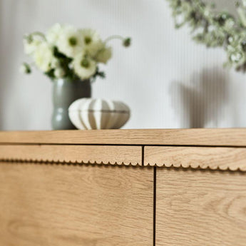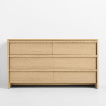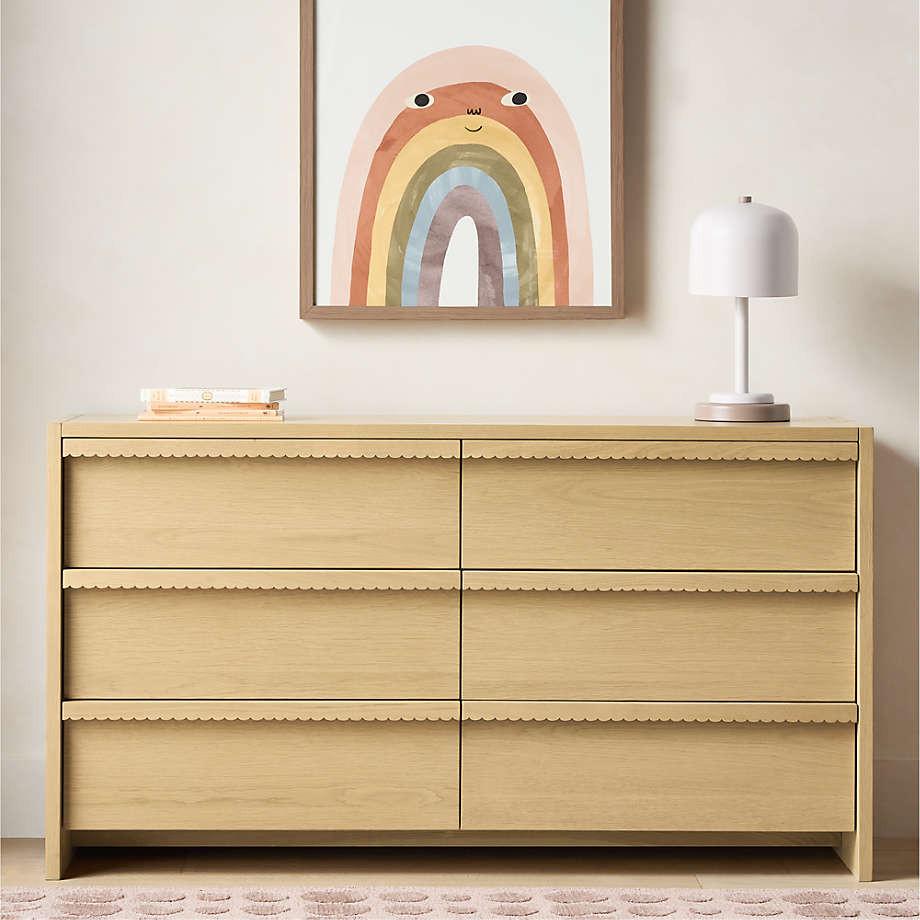 Our Raya 6-drawer dresser combines a generous amount of storage with major curve appeal. Mini scallops along the trim of each drawer lend a playful edge to the piece's clean lines. Made from high-quality, FSC®-certified oak, it's an heirloom-quality piece designed to lastand delightfor many years to come. Pair it with other pieces from our Raya collection for a timeless, coordinated space.