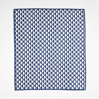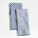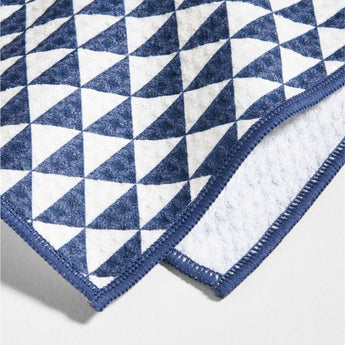Staggered lines and op-art triangles pattern this pair of dish towels in classic indigo and white, bordered neatly with blue overlock stitches. Woven with recycled polyester with a waffle texture, the absorbent fabric dries quickly and stays fresh. We find uses for our exclusive set of two absorbent towels in the kitchen, bathroom, laundry room and more.