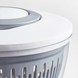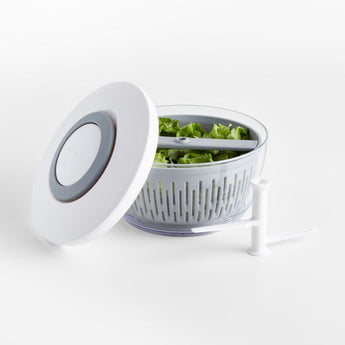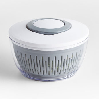 Go from zero to salad in no time with this ingenious spinner that rinses, dries and chops greens. Simply load arugula, spinach or chard in the basket, rinse well and place in the clear bowl. Press the top to spin leaves dry, then add the plastic chopping blade and spin again to chop. The bowl goes right to the table to serve salad. The Chef'n salad spinner and chopper in grey and white is exclusive to Crate & Barrel.