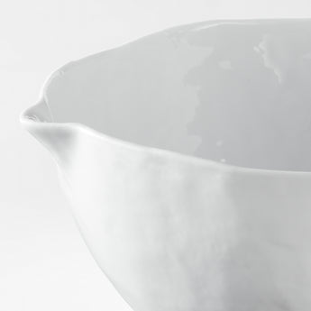 Our contemporary white porcelain bowl represents a fusion of refinement and rusticity. Our mixing bowl takes on organic overtones with a freeform rim and finely "hammered" surface that ripples the light. Fashioned with a diminutive spout, the bowl pours batter into pans and bourbon glaze over doughnuts. Smooth enough to not harm tables, the unglazed bottom surface gives each piece an artisanal look. Our mixing bowl with spout is part of our exclusive Mercer collection.