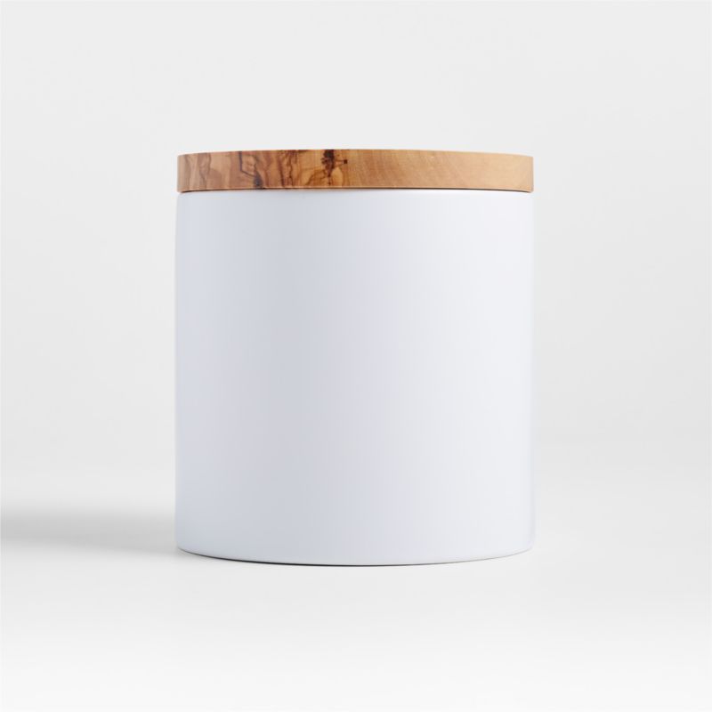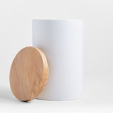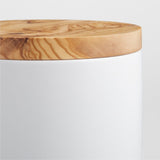 A round of exuberantly grained olivewood tops our sleek stoneware canister, contrasting warmly with the matte white glaze. Filled with sea salt, coffee beans or chickpea flour, the ceramic vessel seals tightly thanks to the silicone gasket. Complete the warm, minimalist look by pairing the small canister with the other essentials in our olivewood kitchen collection.