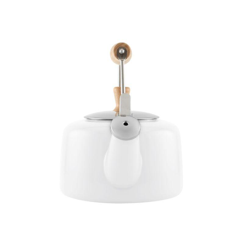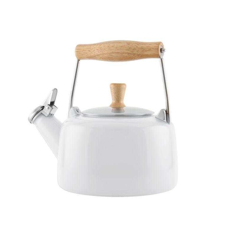Chantal riffs on its vintage-inspired tea kettle to create a new classic. The carbon steel kettle refines its traditional curves with clean lines and a Scandinavian-inspired mix of a white exterior, stainless steel accents and a blond wood knob and handle. Suitable for all cooktops, the whistling tea kettle boils water for pour-over or French press coffee, hot tea, instant oatmeal, couscous and more.