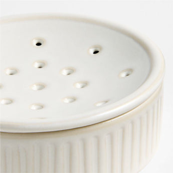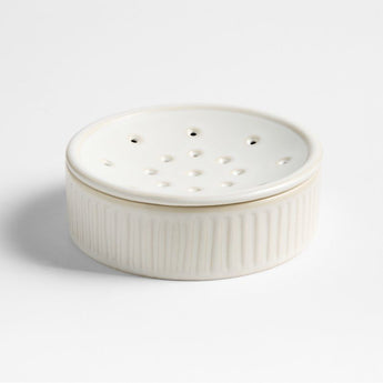 Our new Clean by Crate collection elevates essential tasks and tools to help keep your home beautifully clean. Crafted with recycled stoneware, this hand-glazed brush holder keeps our palm dish brush right at hand so it's easy to grab. A constellation of holes in the top allows water to drain from your brush, and the matte ivory glaze highlights the base's linear texture in this stylish upgrade to your sinkside supplies. Pair with the coordinating ceramic Clean by Crate pieces that all boast the same effortless balance of utility and modern aesthetics.