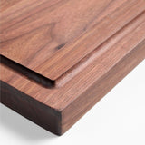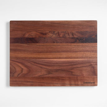 The intentionally simple designs of our signature Crate & Barrel cutting boards keep all the attention on the beauty of wood. Crafted of lengths of walnut, this face-grain board showcases the wood's deep, rich hue and fine, smooth grain. Use the grooved side to collect juices and crumbs as you cut, or flip the substantially thick board over to serve cheese, charcuterie or appetizers. Modern yet timeless, our exclusive board offers versatility, classic good looks and a natural durability that stands up easily to everyday cutting and chopping. Each of our walnut face-grain walnut cutting boards is beautifully unique.