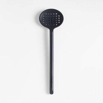 Stir, scoop and serve dumplings, pasta and peas with our signature black silicone slotted spoon. Constructed with a nylon core for strength, the black silicone utensil ably handles boiled potatoes and pot roast, while the grid of perforations allows liquids to drain away. Soft-touch silicone won't damage non-stick pans and resists stains, scratches and heat up to 600 degrees. We love the way the refined beveled edge finishes the elongated handle with a dynamic detail. Combine the dishwasher-safe slotted spoon with the other exquisitely proportioned utensils in our exclusive Crate & Barrel collection for a well-outfitted workspace that's up to any cooking challenge.