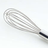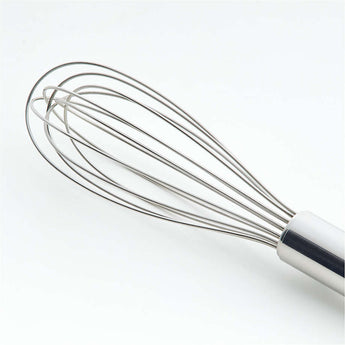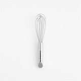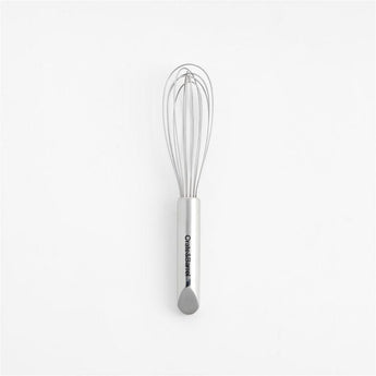 Whip up batches of egg whites, marinades and whipped cream with our signature stainless steel whisk. The sturdy utensil ably mixes the thickest batters or folds the most delicate meringues. Polished stainless steel shapes a sleek whisk with a cylindrical handle for a sturdy grip and a professional look. We love the way the refined beveled edge finishes the elongated handle with a dynamic detail. Combine the small dishwasher-safe whisk with the other exquisitely proportioned utensils in our exclusive Crate & Barrel collection for a well-outfitted workspace that's up to any cooking challenge.