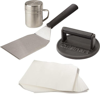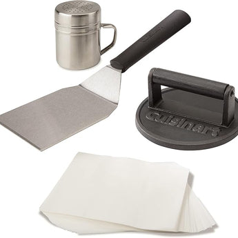 - Elevate your burger game with the Cuisinart Smash Burger Kit, designed for grill and griddle enthusiasts who crave a crispy, flavorful smash burger every time. This essential BBQ kit includes everything needed to master restaurant-quality burgers: a Cast Iron Burger Press for perfect searing, a durable Stainless Steel Burger Spatula for easy flipping, a Stainless Steel Seasoning Shaker to add your signature blend, and 100 Restaurant-Grade Patty Papers for a mess-free smash. Simply press down to lock in juicy flavors and create a savory crust that makes each bite unforgettable. Perfect for cookouts, barbecues, or grilling up burgers on the griddle, this kit brings a pro-level touch to your next backyard BBQ