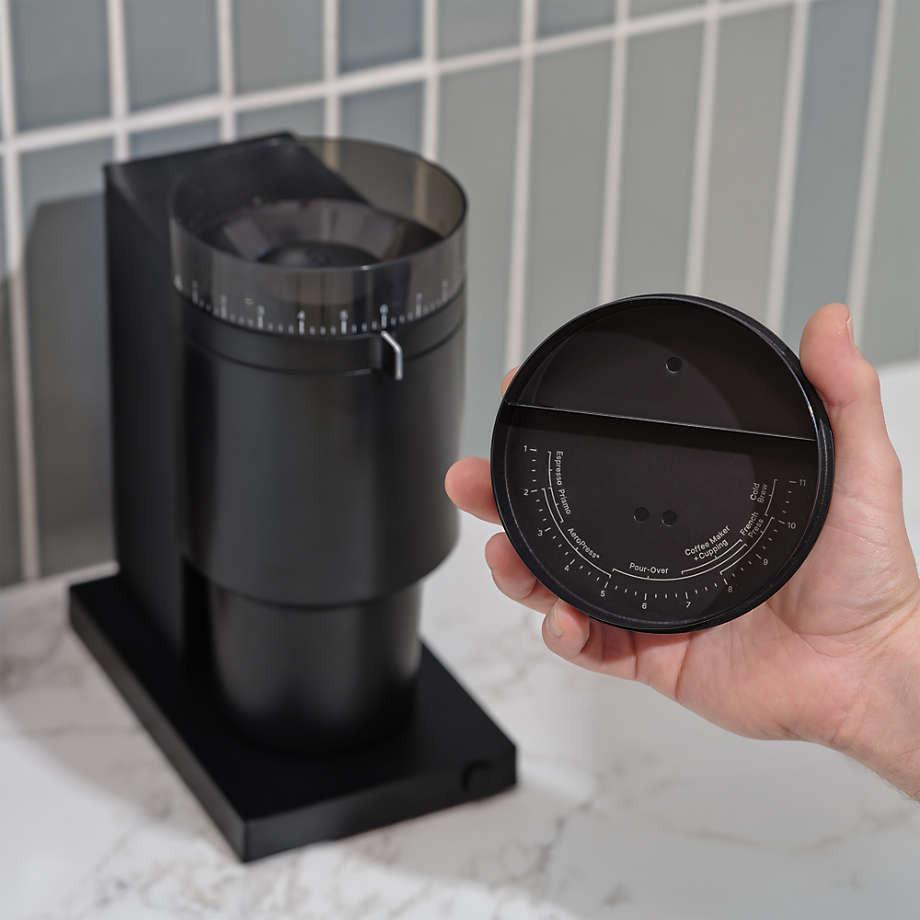 Sleek and ultra-modern, Opus grinds beans precisely for espresso as well as pour-over, drip, French press and cold brew coffee. The black grinder offers 41 fineness settings as well as more nuanced grinding options with a twist of its inner ring. The single-dose load bin limits beans' exposure to freshness-robbing oxygen, and flat stainless steel burrs offer professional-quality grinding. If you don't have a scale on hand, flip the lid over to measure 20, 40 or 100 grams of beans to suit your brewing method. With its combination of smooth and ribbed surfaces in matte black, the grinder pairs beautifully with our other Fellow coffee essentials.