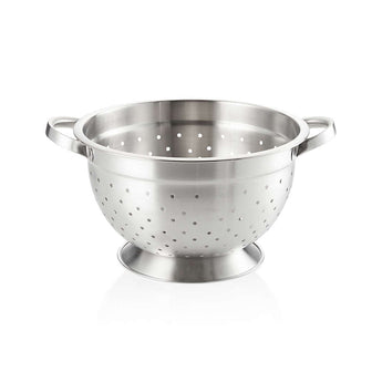 Generous five-quart stainless steel colander has a beautiful, non-reactive finish and easy-to-grasp handles. Footed design keeps its stable while draining produce and straining broth.
