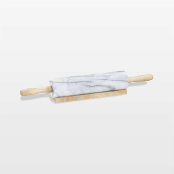 Beautiful, cool white marble rolling pin has the smoothness and heft to handle even the toughest dough. Display-worthy rolling pin nests in a rubberwood stand that matches the ergonomic handles. Each pin will differ due to the natural characteristics of the marble. Because marble is a natural product, veining and coloring variations will occur; see additional images for examples.