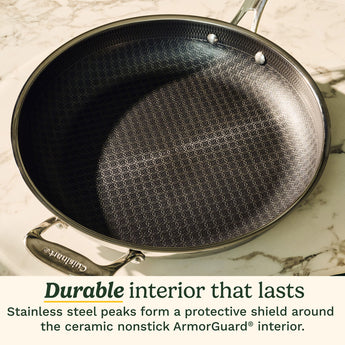 Perfect searing meets nonstick ease. The FusionPlus™ Everyday Pan combines stainless steel durability with the superior nonstick performance of PURELYSEAR™ ceramic technology. An aluminum core ensures fast, even heating, while the ArmorGuard® ceramic interior resists scratches—even from metal utensils. Induction-ready and dishwasher safe, this 12-inch pan is made to perform daily.