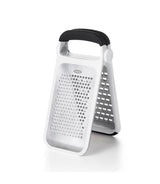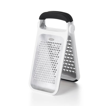 Two tools in one allow you to grate hard and soft cheeses, chocolate, potatoes, onions and more. The OXO Good Grips Etched Two-Fold Grater has extra-sharp, etched stainless steel grating surfaces that stand upright together over a cutting board or detach for use over a bowl. Coarse and medium grating patterns give you different options. The soft handle provides a comfortable grip, while non-slip feet stabilize the grater as you work