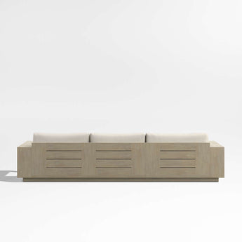 Settle into the enduring coastal comfort of Mallorca. Designed to last season after season, the sectional showcases the long-lasting durability and natural beauty of eucalyptus wood, which has been painted and wirebrushed to resemble naturally weathered driftwood. The linear frame's modern lines and bold geometry feature wide arms and a plinth base for a contemporary look. Soft-yet-supportive cushions are covered in outdoor-friendly ivory fabric or your choice of colors in performance Sunbrella fabric.