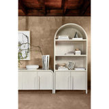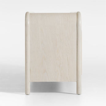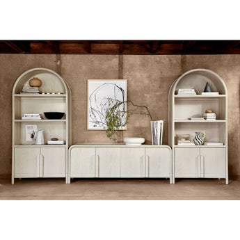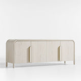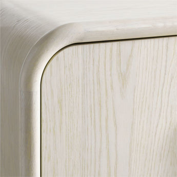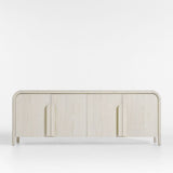 The traditional credenza takes a contemporary turn in Annie. Made of solid oak and oak veneer with a light, bright whitewash finish, the credenza showcases a rounded silhouette. Bentwood poles flow a continuous arc from leg to leg, framing two cabinets with flat-front doors that show off the wood grain. Cleanly integrated into the arcing design, long, rounded pulls open to reveal one adjustable shelf per cabinet for storing table linens, audio equipment or dining room serving ware.