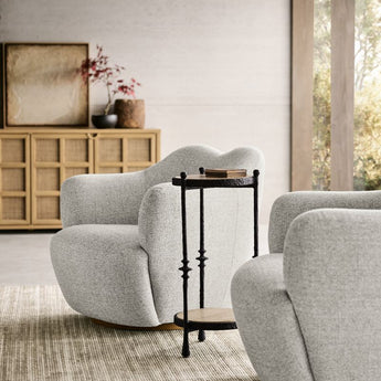 Inspired by Swedish modern design, Apero pairs cozy curves with pillowy contours. The fully upholstered chair embraces with rounded arms that flow into a subtle camel back accented with two button tufts. The seat cushion wraps snuggly around the arms for curl-up comfort and a rounded silhouette. Providing a full 360 degrees of swivel, the round recessed plinth base lightens the look with a peek of oak veneer. Hugging all the softness is a durable fabric in light grey flecked with hints of tan and blue and woven like a fine Scottish tweed.
