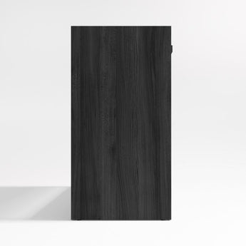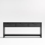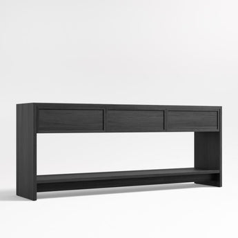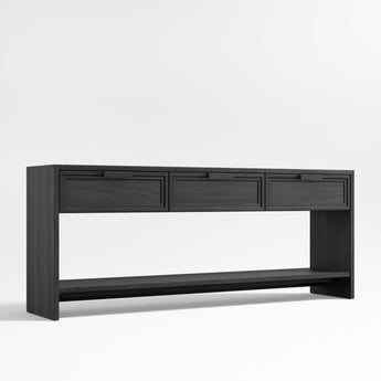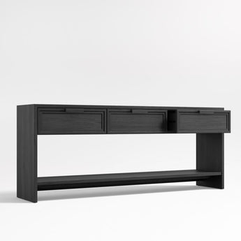 Calypso opens up living or dining room room storage with a light and airy look. Consisting of three drawers and a wide open shelf, the large console provides closed storage and display space. Stepped detailing and horizontal pulls add linear design notes, while wirebrushing and a charcoal finish bring out the beautiful elm grain.