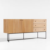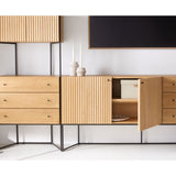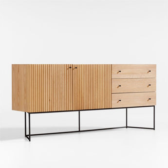 Mid-century Japanese design provides the inspiration for this eye-catching, mixed-material media console. Floating on an open, angled base of black patina-finished iron, the console showcases sustainably sourced elm and elm veneer with a natural finish. Fluting running in two directions textures the facade, enhancing the console's simple, box-like contours with linear movement. Petite conical knobs pepper the sideboard with contrast, opening three drawers and a double-door cabinet. For expanded storage, pair the media console with a coordinating bookcase or two.