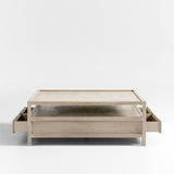 Given a neutral driftwood finish, Keane complements any decor with clean lines and the organic beauty of natural wood. Channel detailing lends eye-catching dimension and linear interest to the coffee table's architectural lines. A generously sized open shelf provides space to stow magazines, books or trays, while four drawers punctuated by brass-finished pulls offer closed storage for remotes, coasters and other living room sundries. Our best-selling Keane collection is a Crate & Barrel exclusive.