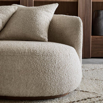 Feel free to rearrange, style or layer Martina's scatter-back pillows for the look and coziness level you desire. Tight seat cushioning accentuates the subtle kidney-shape and rounded corners of the deep-sitting bench seat. Proportioned low to highlight the pillow back, the rounded back wraps around the curved seat. Following the sofa's curves, a solid walnut plinth base adds the warmth of wood and lets the sofa float. Off-white linen-blend upholstery has the cozy feel of wool and a rich textural weave that yields subtle variations in tone.