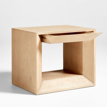 Like a picture frame, our Vernon side table uses mitered corners and angles to bring focus to the beauty of natural wood. Made of sustainably sourced pine with a lightly bleached finish, the geometric side table uses a reverse bevel edge to create the open square frame. A single drawer is cleverly mitered into the frame to keep the look seamless. Light wire brushing lends texture to the wood while highlighting the wood's cathedral and quarter-sawn graining. The Vernon side table is a Crate & Barrel exclusive.