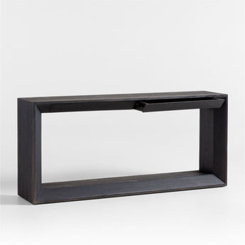 Like a picture frame, our Vernon console table uses mitered corners and angles to bring focus to the beauty of ebonized wood and pure lines. Made of pine with a dark ebonized finish, the table incorporates a reverse bevel and waterfall edges to outline an open, eye-catching rectangle. Precise woodworking integrates two drawers seamlessly into the frame to keep the lines ultra clean and modern. Light wirebrushing lends texture while highlighting the wood's cathedral and quarter-sawn graining. The Vernon ebonized console table is a Crate & Barrel exclusive.