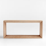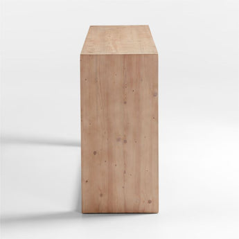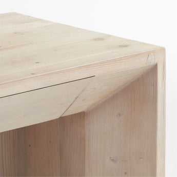 Like a picture frame, our Vernon console table uses mitered corners and angles to bring focus to the beauty of natural wood and pure lines. Made of pine with a light whitewash finish, the table incorporates a reverse bevel and waterfall edges to outline an open, eye-catching rectangle. Precise woodworking integrates two drawers seamlessly into the frame to keep the lines ultra clean and modern. Light wirebrushing lends texture while highlighting the wood's cathedral and quarter-sawn graining. The Vernon natural console table is a Crate & Barrel exclusive.
