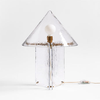 Inspired by layered ice formations, our Vespera table lamp captures the ethereal beauty of frozen water. Made entirely of clear and subtly textured cast glass, the lamp features a curved panel base and a conical shade. Burnished brass-finished details warms the icy light, gleaming through the subtly textured glass. We love the exquisite presence of this lamp, especially paired with the coordinating Vespera flush mount light.