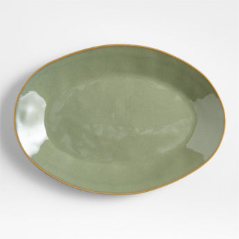 Artisans finish each piece of bestselling Marin by hand. This serving plate's sage green reactive glaze showcases rich tonal color and natural variations that make each one unique. A light tan rim highlights the oval platter's organic contours while adding a kiss of contrast.