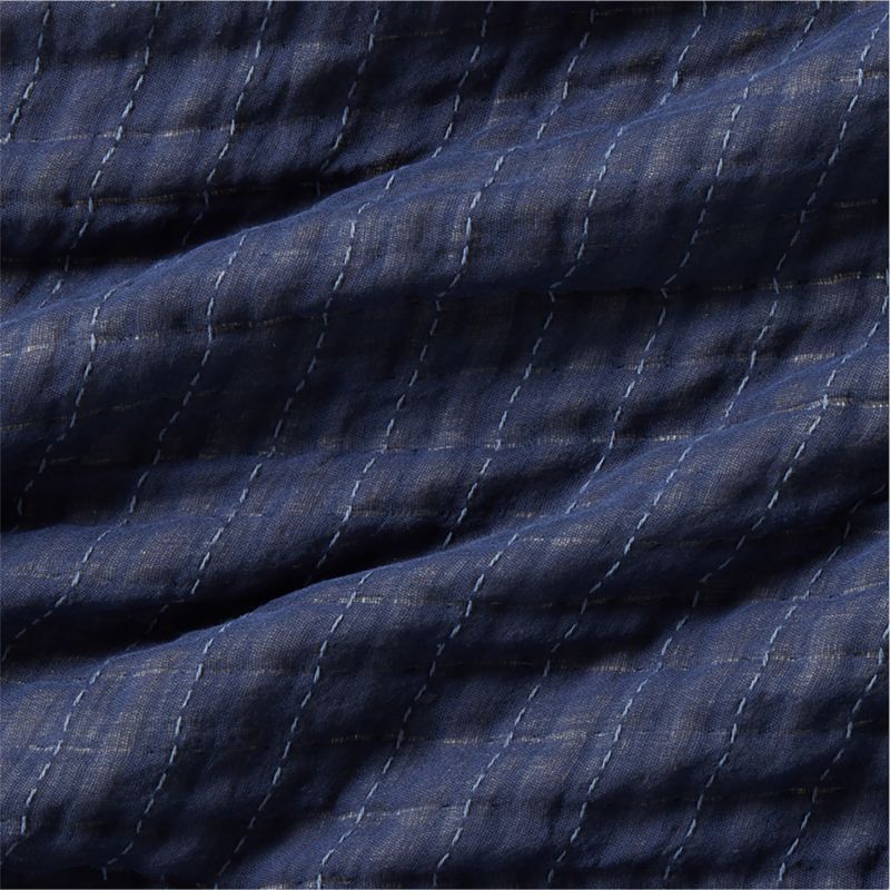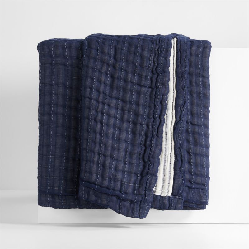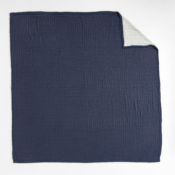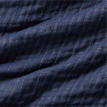 Fine organic cotton threads weave a bed blanket with a cloud-soft hand feel and irresistible fluffiness. With a double-layer construction for an extra-downy finish, the blanket's puckered grid in deep indigo blue reverses to cream with blue pinstripes. Mix and match with our bedding in the same palette or drape across the foot of the bed for an inviting layer of warmth and coziness. Elegant yet relaxed, our gauze blanket is machine washable and low maintenance.
