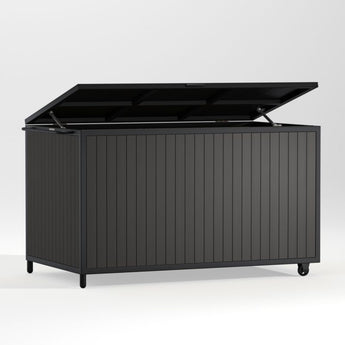 Our Alfresco outdoor furniture collection emulates the look of real wood with clean lines and all-weather durability. Finished in sleek black, the storage box sets faux wood slats within a sturdy yet lightweight aluminum frame. The top lifts to ample storage space for stowing cushions, pillows, blankets or more. Two wheels let the box move about as an extra serving station or bar.