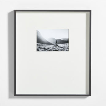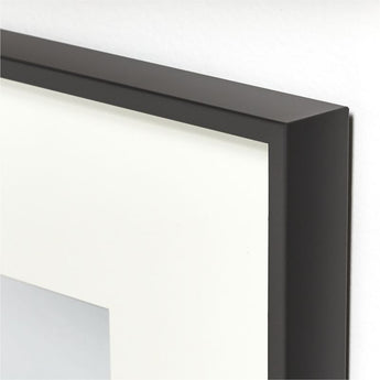 Our brushed black frame adds drama to photo and print displays with shadow-box styling and generous offset mat. This vertical frame presents a 5"x7" horizontal photo just above center in a wide-margin mat for an elevated, gallery-like look. A Crate & Barrel exclusive, our aluminum frame with brushed black finish is designed to be displayed on the wall.