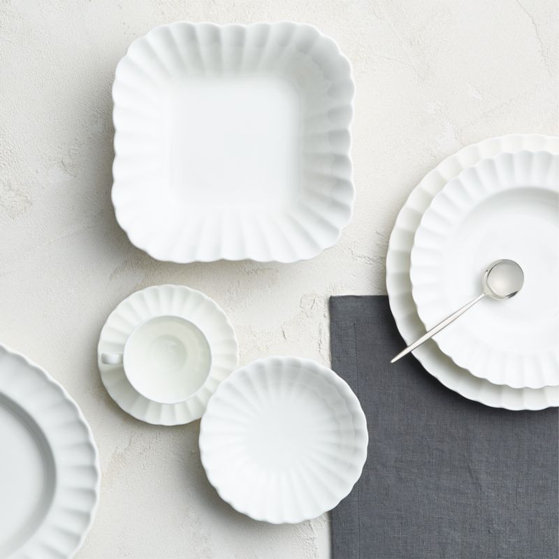 Softly translucent and classically white, our Capella bone china brings timeless elegance to the table. Scalloped rims lend a graceful accent to the dinner plate's gentle coupe contours, while the ceramic's high calcium content gives it its creamy white color and subtle luminosity. Despite the delicate shape, the plate boasts exceptional durability and edge strength