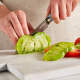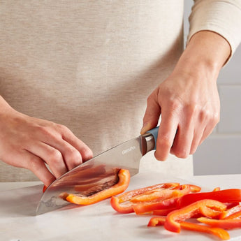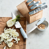 - Set: 4" paring knife, 5" utility serrated knife, 5" and 7" santoku knives, 8" slicing knife, 8" bread knife, 8" chef's knife, 6 steak knives, kitchen shears, sharpener and knife block