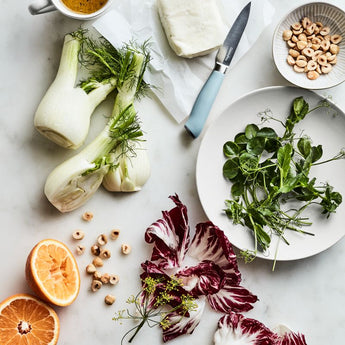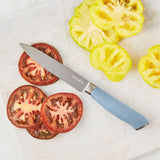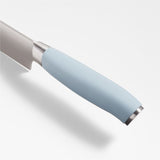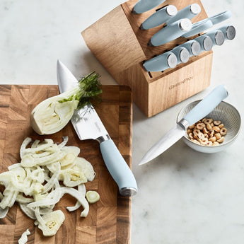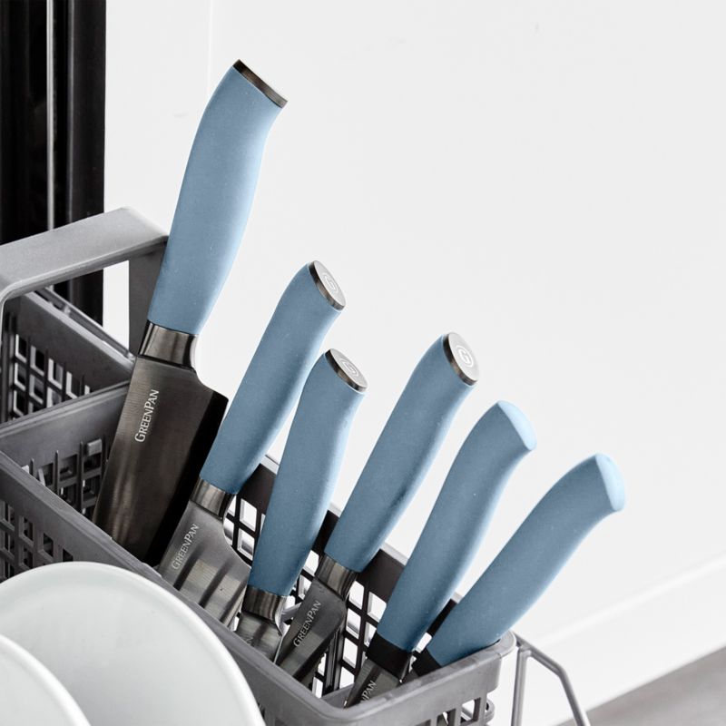 This 16-piece knife set brightens your kitchen in an irresistible shade of blue created just for Crate & Barrel. The stainless steel blades are coated with titanium for durability, frictionless cutting and sharpness that lasts. Skilled craftspeople sharpen the knives by hand, and ergonomic handles in our exclusive Blue Haze hue provide a secure, comfortable grip even with wet hands. Dishwasher-safe for easy cleanup, this essential set includes a 4-inch paring knife, 5-inch utility serrated knife, 5- and 7-inch santoku knives, 8-inch slicing knife, 8-inch bread knife, 8-inch chef's knife, six steak knives and a pair kitchen shears, all in a wood knife block. The included pull-through sharpener keeps all of your knives in optimal condition.