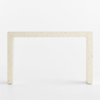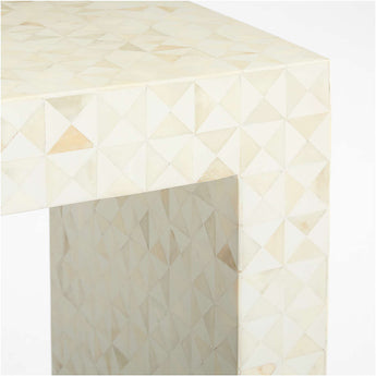 True to the tradition of intarsiathe time-honored technique of fitting together bits of wood in a mosaic-like designskilled craftsmen inlay triangles of handcut resin and bone to create this artisanal console table. The simple Parsons-style design lets the workmanship and materials take center stage, allowing this exclusive, one-of-a-kind piece to take center stage.