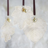 Our maple leaf Christmas tree ornament brings nature's beauty to the Christmas tree. Its delicate leaf design is rendered in golden metal wire and resin for a lacy effect and is accented with a gold metallic acorn charm adds and brown hanging ribbon.