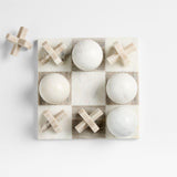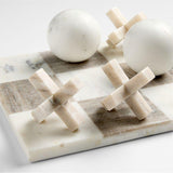 Our fully playable tic-tac-toe game doubles as a sculptural conversation piece. Crafted of beige and white marble hand polished to a satin finish, the set translates the game's Xs and Os into three-dimensional spheres and cruciforms that play out on a checked board.