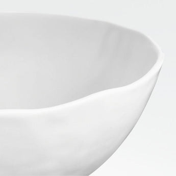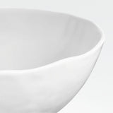 Contemporary porcelain whiteware represents a fusion of refinement and rusticity. The slim profile of this low bowl takes on organic overtones with a freeform rim, matte white glaze and finely "hammered" surface that subtly ripples the light. Smooth enough to not harm tables, the unglazed ceramic bottom surface gives each dinner bowl an artisanal look.