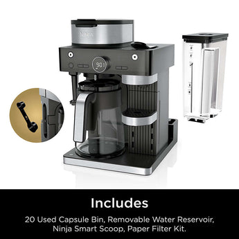 - Includes used capsule storage bin, removable water reservoir, Ninja Smart Scoop warming plate, paper filter kit and 12-cup glass carafe