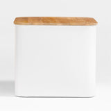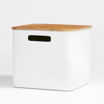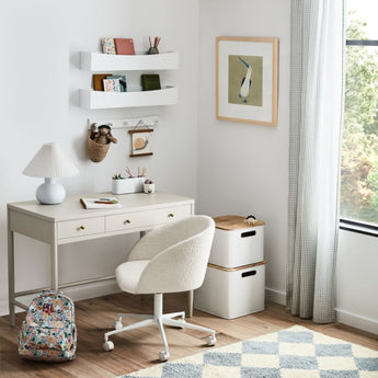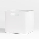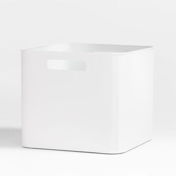 Contain anything and everything with our simple, stylish Outline metal storage bin. Designed for versatility and built to handle years of use, the white iron bin is deep enough to keep books upright, craft supplies organized or study essentials always where you need them. Cutout handles on each end are easy for kids' hands to grip. They're minimal, functional and totally convenient—purchase multiple to stack them vertically, saving precious floor space.