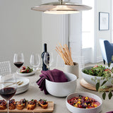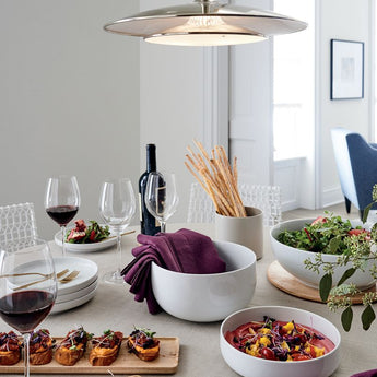 Crisp white porcelain dinnerware trends modern and flexible in modern, rounded coupe shapes perfectly at ease in casual and formal settings. Low curves allow for easy stacking and space-saving storage.