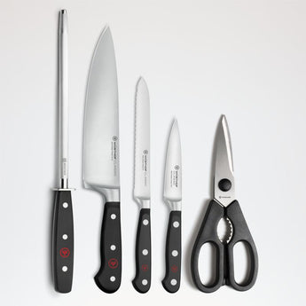 Cut, chop and slice like the pros with this deluxe knife set from Wüsthof, one of the most respected names in cutlery. Knives feature high-impact synthetic handles that are comfortable to hold and more durable and sanitary than wood. Strong, long-lasting, high-carbon stainless steel blades hold their edge and maintain their shape. With extra space for a set of steak knives (not included), the gorgeously grained 15-slot acacia wood knife block holds the 3.5" paring knife, 5" serrated utility knife, 8" cook's knife, 9" honing steel and come-apart kitchen shears.