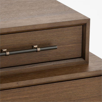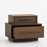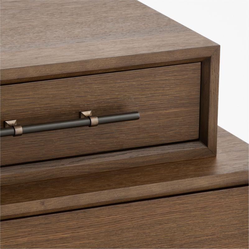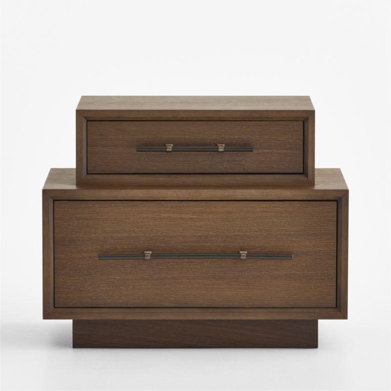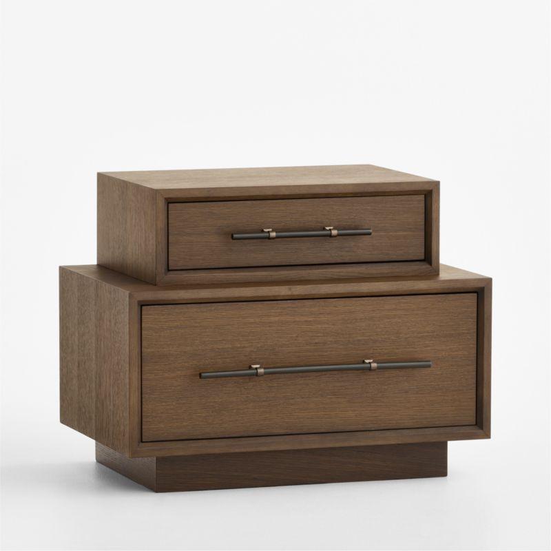 Our Larchmont nightstand takes a bold architectural approach to bedside storage. The stacked design places a smaller drawer atop a larger one, accented with a plinth base and chamfered edges. Long pulls made of dark brown resin to resemble horn are anchored to the fronts with iron fixtures finished in burnished brass. Crafted of oak, the nightstand has a fumed finish that adds smoky tints while highlighting the wood's cathedral graining.
