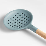 Stir, scoop and serve dumplings, pasta and peas with our signature silicone and wood slotted spoon. Constructed with a nylon core for strength, the sage green silicone head ably handles boiled potatoes and pot roast, while the grid of perforations allows liquids to drain away. Soft-touch silicone won't damage non-stick pans and resists stains, scratches and heat up to 600 degrees. Natural beechwood shapes a sleek cylindrical handle for a sturdy grip and a warm, classic look, and a refined beveled edge finishes the handle with dynamic detail. Combine the sage green slotted spoon with the other exquisitely proportioned utensils in our exclusive Crate & Barrel collection for a well-outfitted workspace that's up to any cooking challenge.