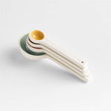 Our Bloom measuring-spoon set scoops ingredients in a cheerful-yet-sophisticated palette of modern spring hues. The four stoneware spoons are glazed glossy white, then painted by hand in golden yellow, muted teal and two shades of pink on their interiors. For colorful, coordinated baking—or a gift for your favorite baker—pair the dishwasher-safe measuring spoons with the other essential tools in our exclusive Bloom collection.