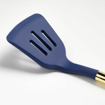 Gleaming brass and royal blue silicone pair up in an eye-catching upgrade on the classic turner. The silicone head flips, fries and serves while resisting heat up to 450°F for worry-free cooking. The copper-plated stainless steel handle provides a sturdy grip. Our exclusive Wyn turner adds a fashion-forward color combination to your kitchen, especially gathered in one of our countertop utensil holders with the other essential tools in the Wyn utensil collection.