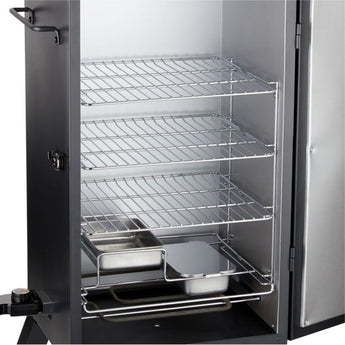 Smoking made simple. This attractive black electric smoker is just the thing for enthusiastic cooks who might be intimidated by smoking or don't want to bother with charcoal. Just add wood chips and water to the designated pans, plug in the smoker, and you're ready to go. The electric heating element provides a range of 100°F to 400°F, the heat controller allows you to carefully adjust the cooking temperature, and the built-in thermometer lets you monitor the heat. Three extra-large chrome-coated racks provide enough cooking space for generous amounts of meat, poultry, vegetables and fruit.